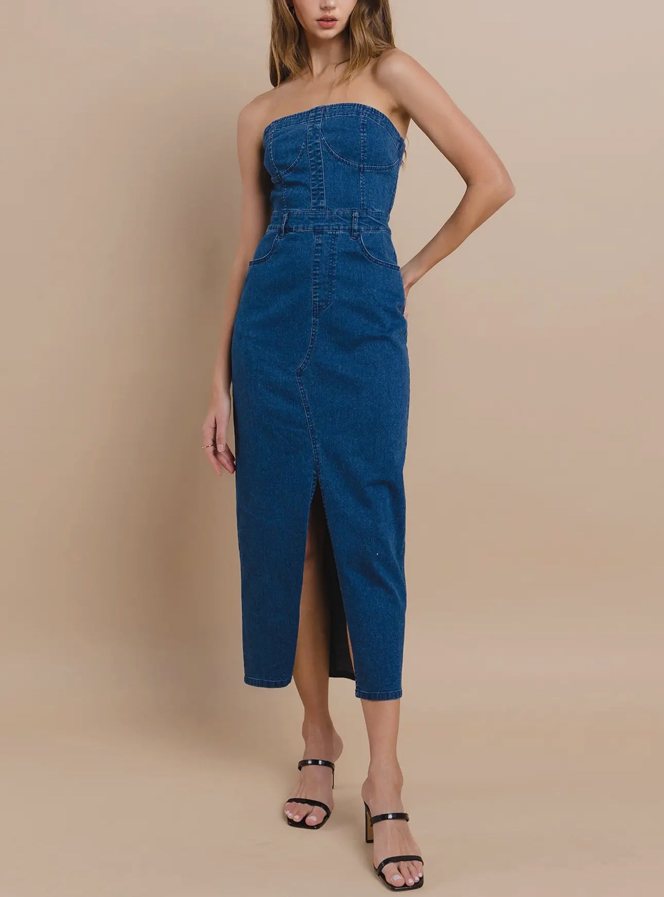 This denim strapless dress is designed for a stylish and comfortable look. Made from durable denim material, it offers a sleek and secure fit that is perfect for any occasion. With its strapless design, this dress is both fashionable and functional, making it a must-have in any wardrobe. Upgrade your closet with this versatile and trendy piece.