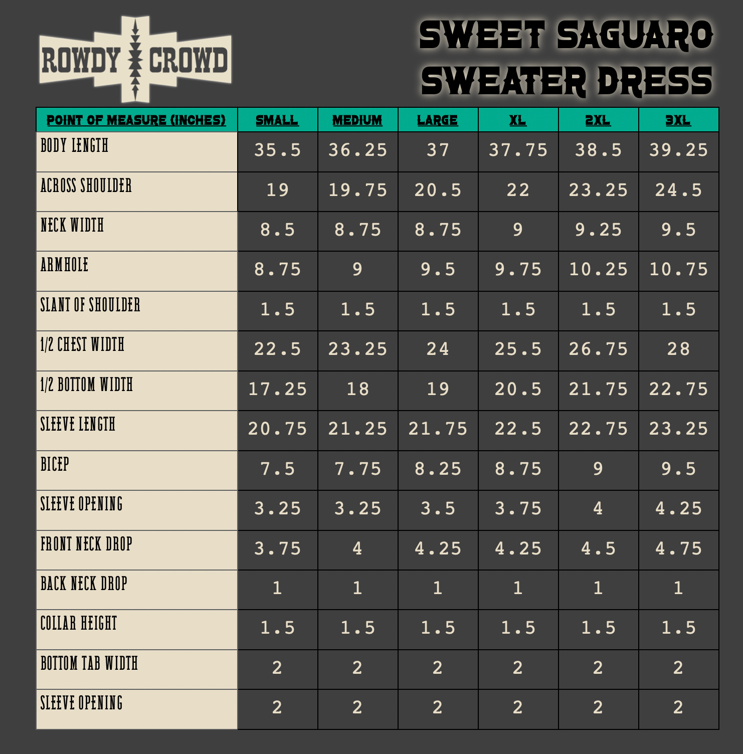 Embrace the desert vibes with our Sweet Saguaro Sweater Dress. Featuring a stunning black and cream desert print, this comfortable dress is the perfect length and true to size. Update your wardrobe with confidence and style!